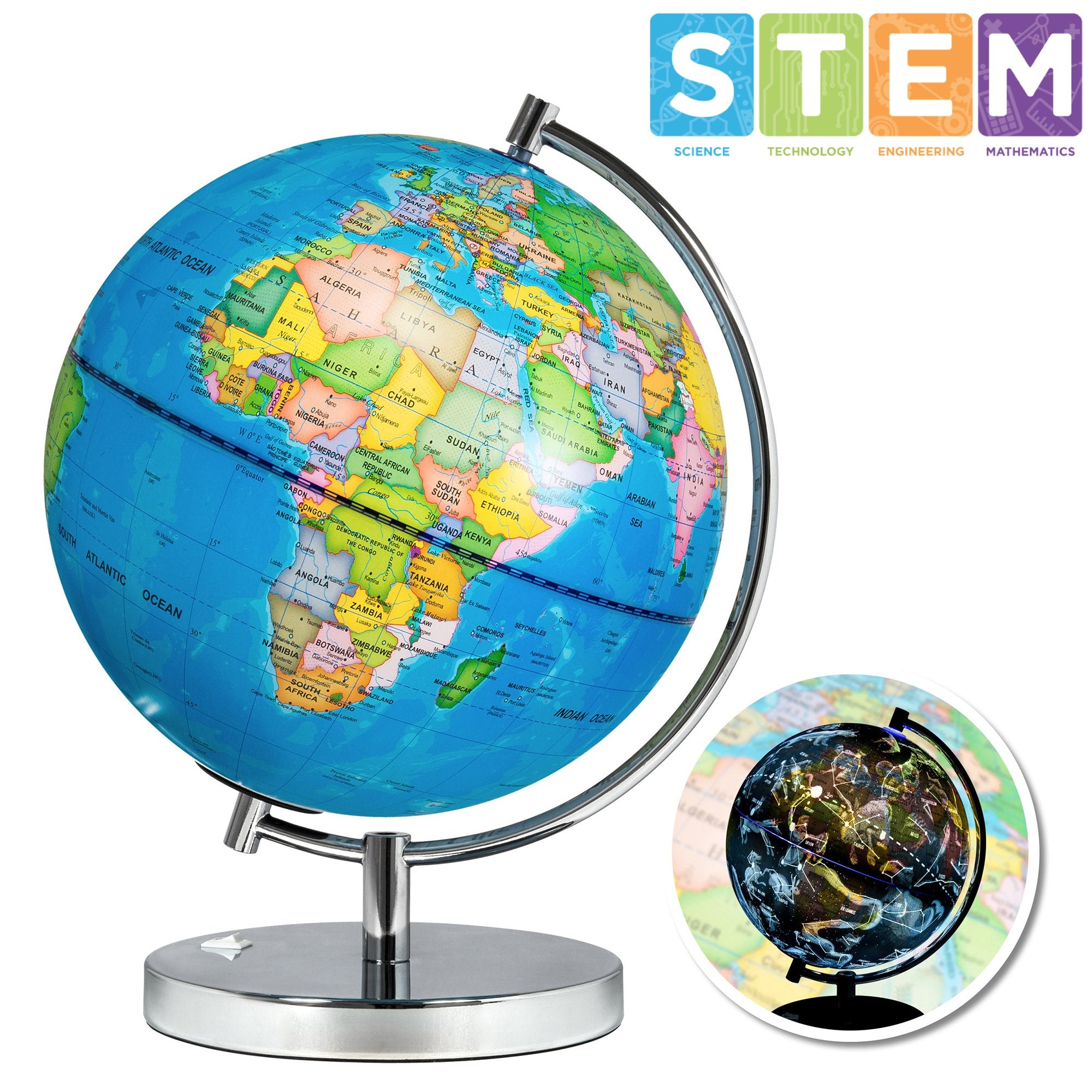 STAINLESS STEEL STAND: The sturdy steel stand ensures lasting use and makes it easy to clean, while also allowing the globe to spin