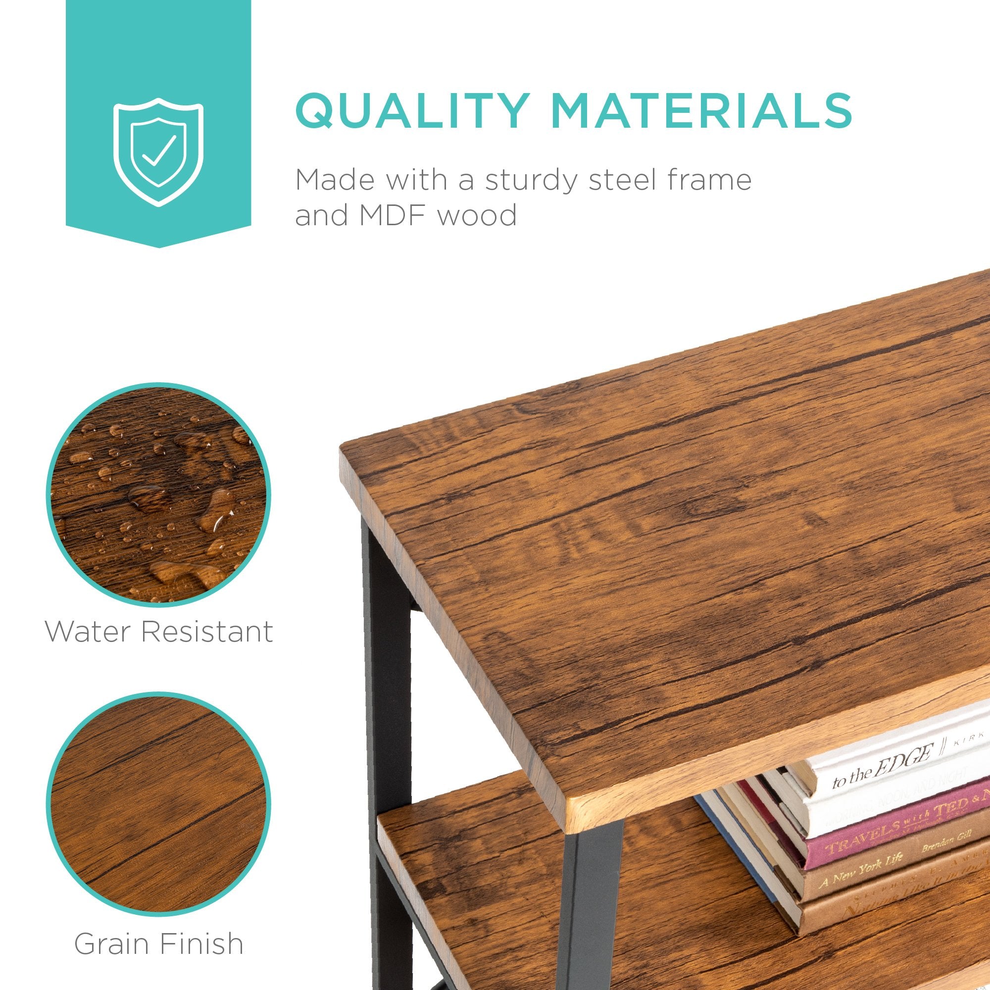 STURDY BUILD: Industrial shelf is crafted with MDF grade wood and a veneer finish with PVC wrapping for an attractive finish and protected water-resistant surface