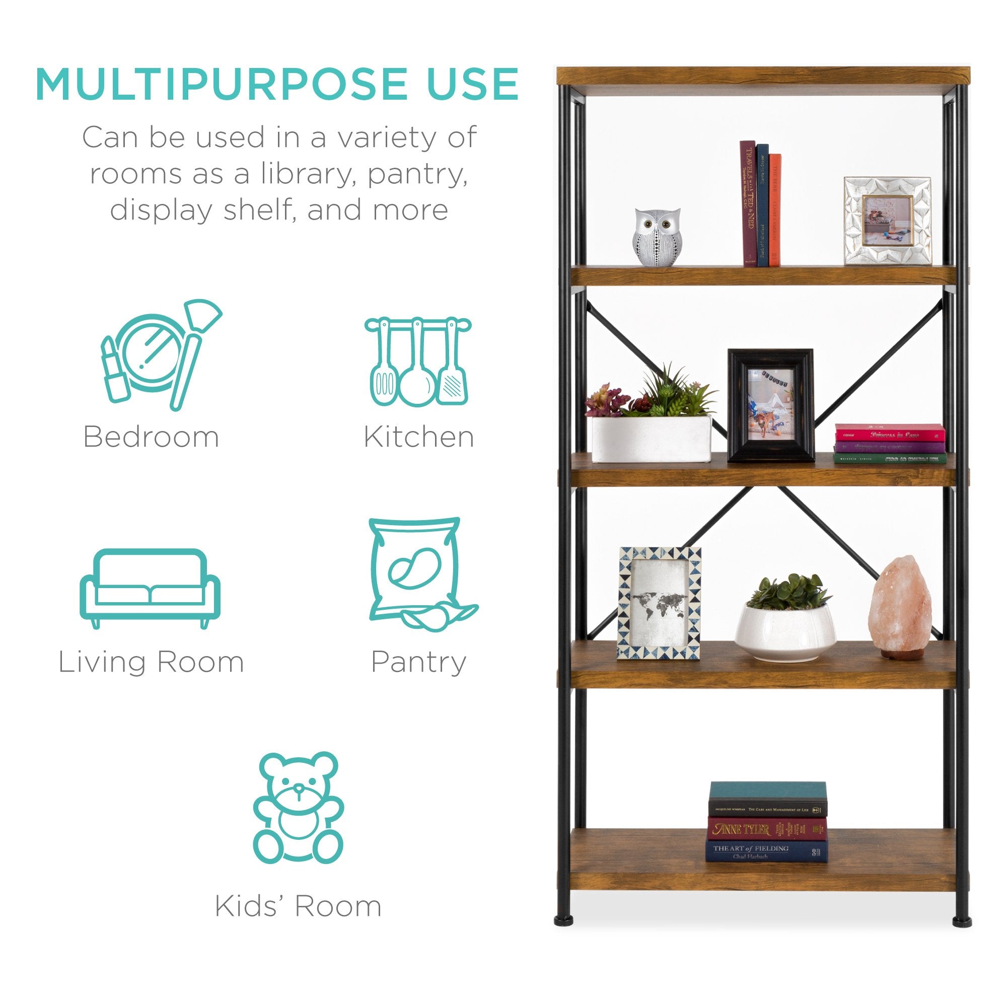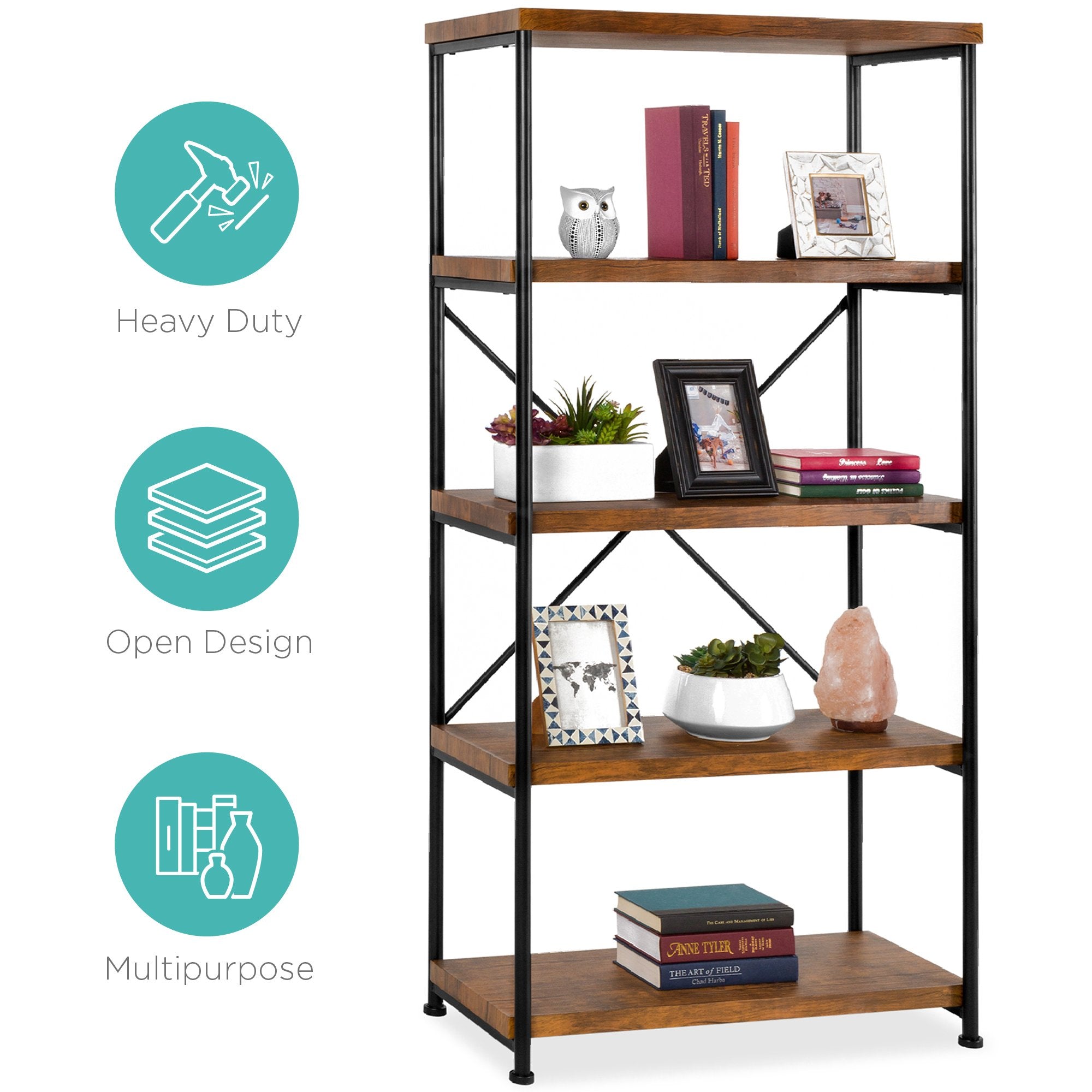 5-Tier Industrial Bookshelf w/ Metal Frame, Wood Shelves
