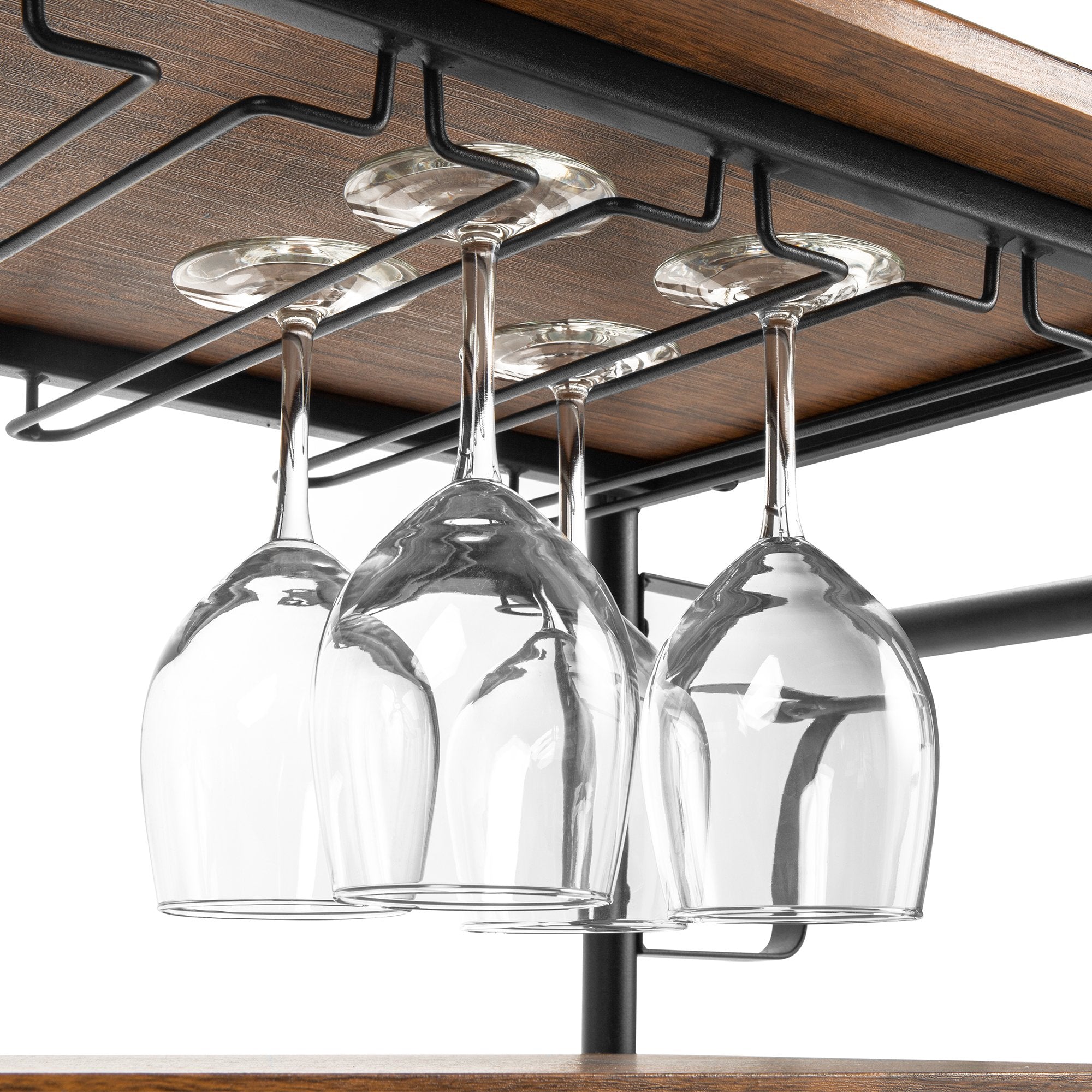 • DEDICATED STORAGE SPACE: Features specialized storage racks for glasses on the first shelf, a bottle rack, and a second shelf for your cheese platters or brunch plates, providing a classy, all-in-one wine stop
