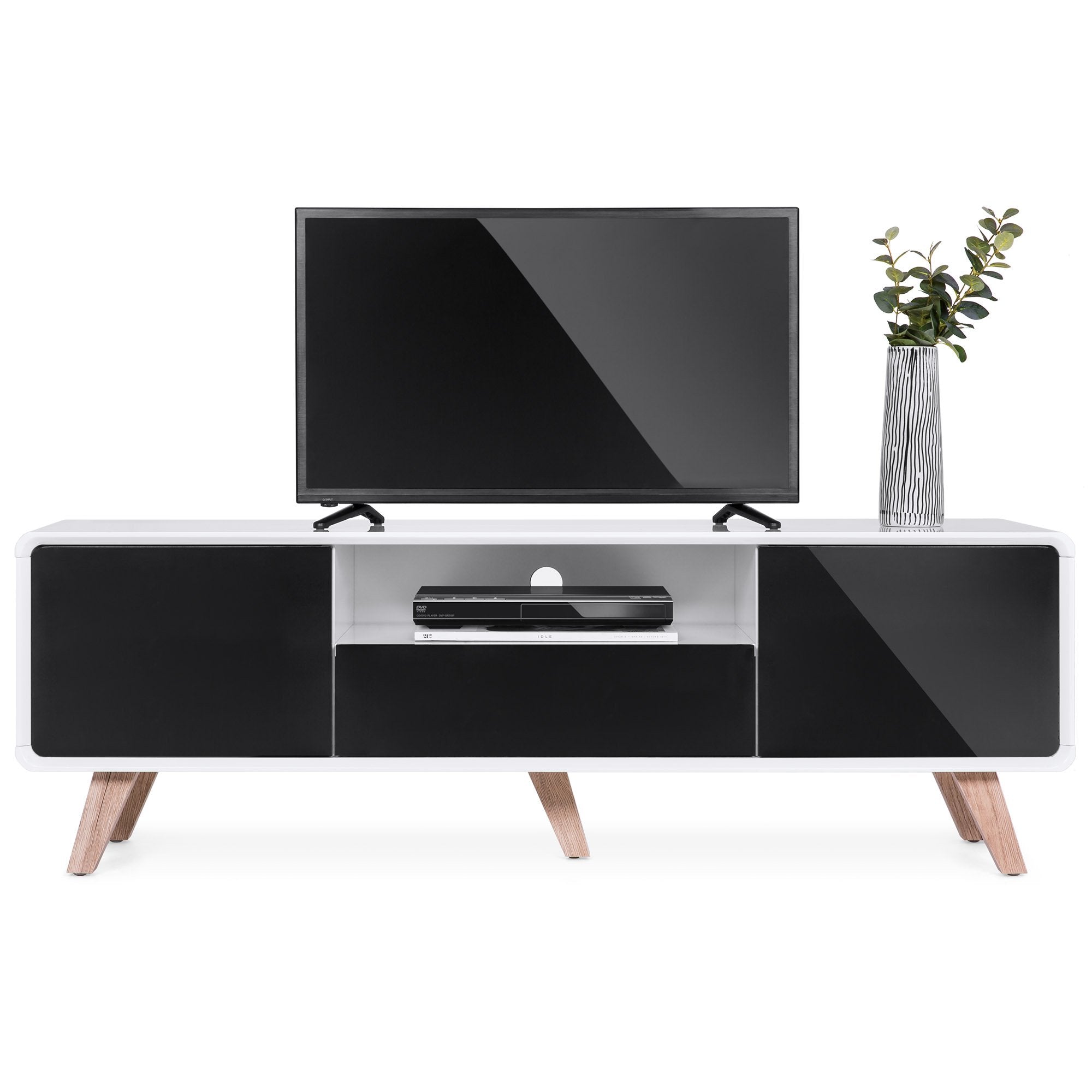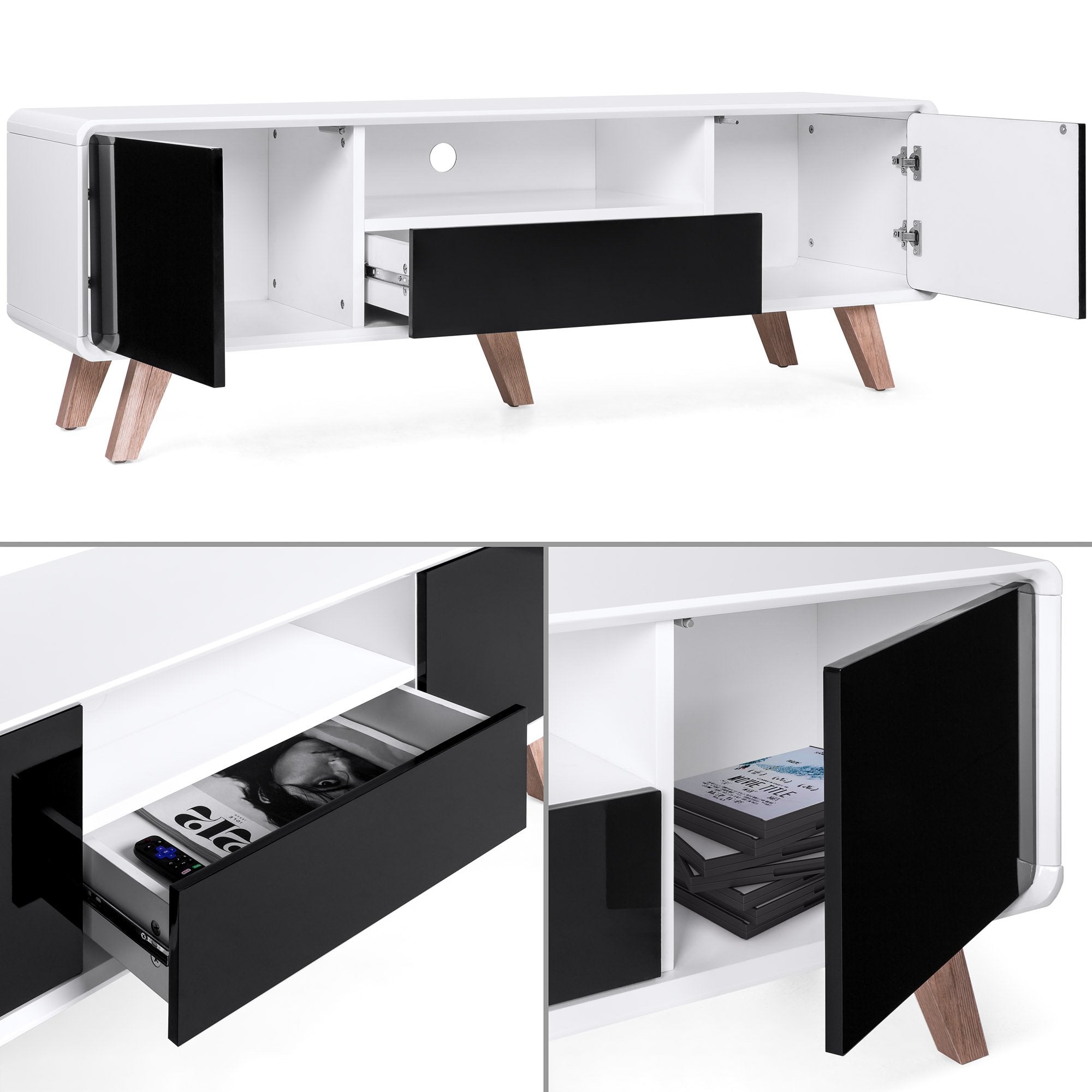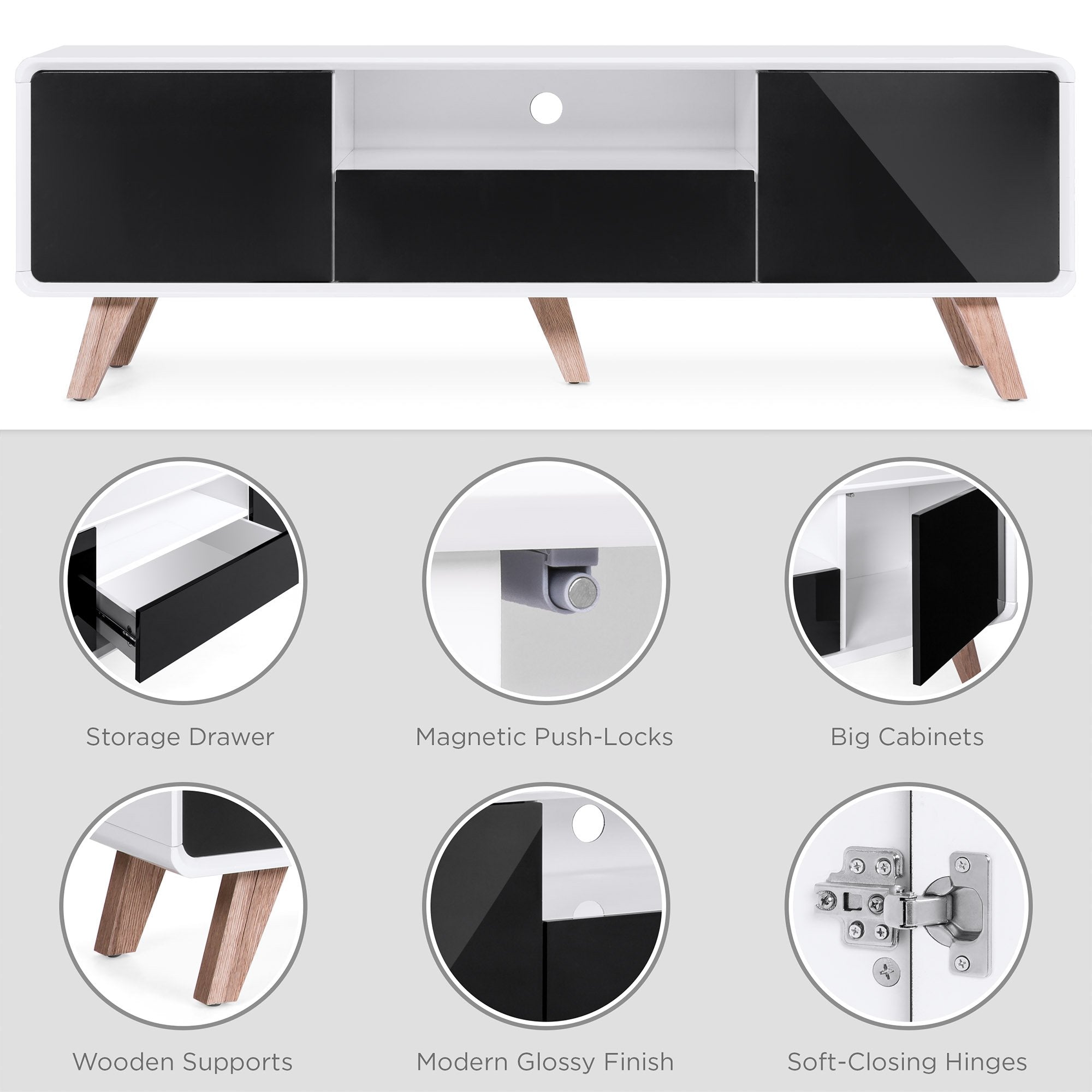 STYLISH ENTERTAINMENT CENTER: 2-tone TV stand is crafted with a polished, black-and-white surface, fusing mid-century style and contemporary design to give an eye-catching appeal to any living space