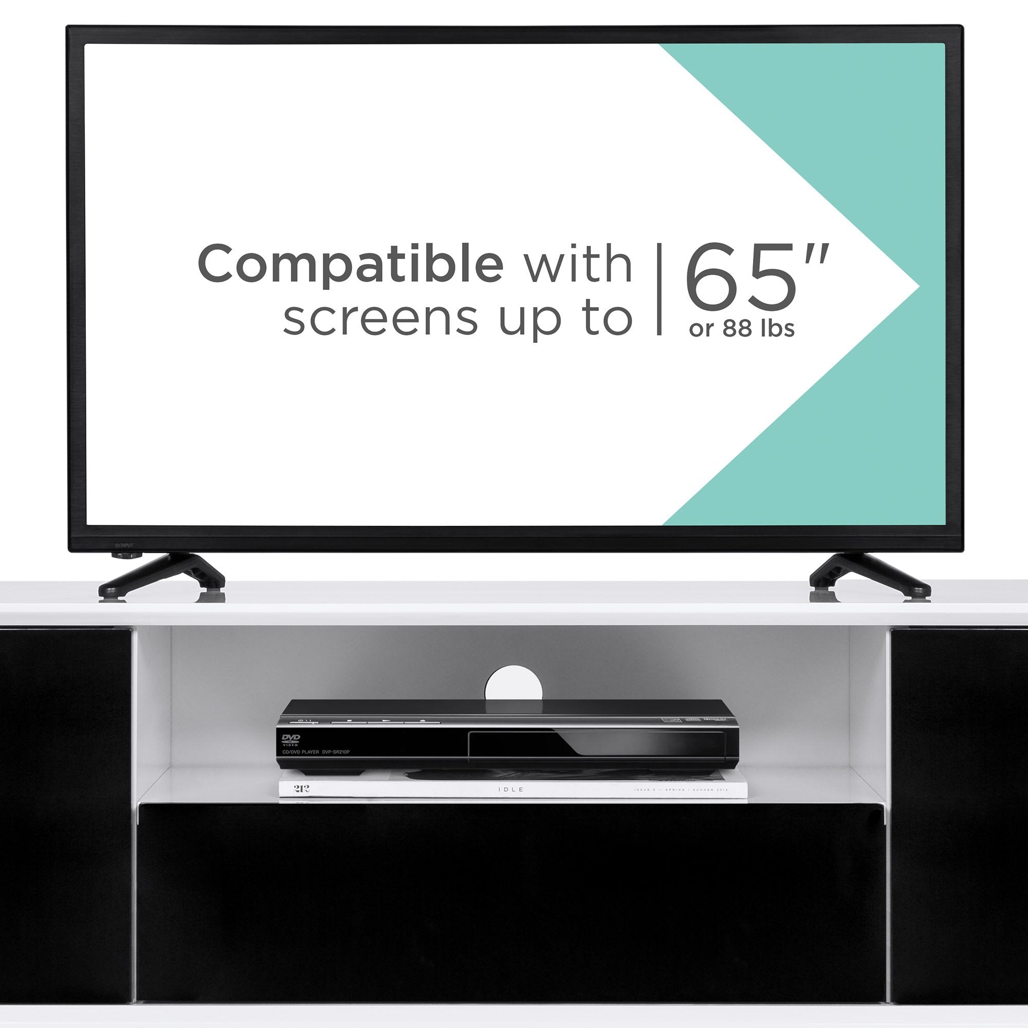 SPACIOUS DESIGN: 59-inch-wide surface holds up to a 65-inch television and maintains an organized appearance, featuring a center console area and cabinet space for storing electronics, books, and more