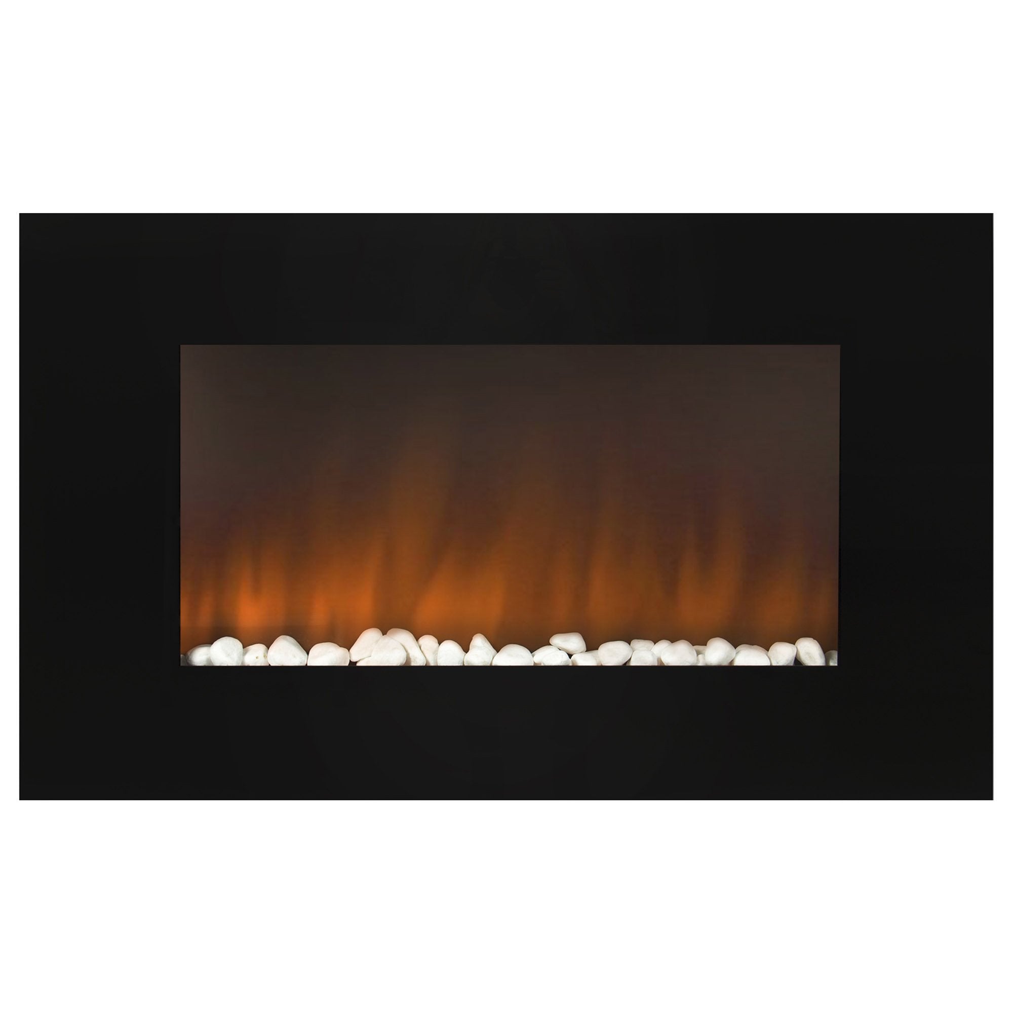 Wall mounted, electric fireplace has a 3D flame technology and a 5200 BTU for heat settings: low, medium, and high