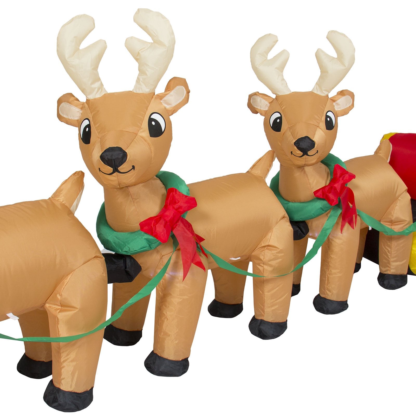 Pre-lit inflatable Christmas decor features a Santa on a sleigh and 3 cute reindeer ready to get the holidays started