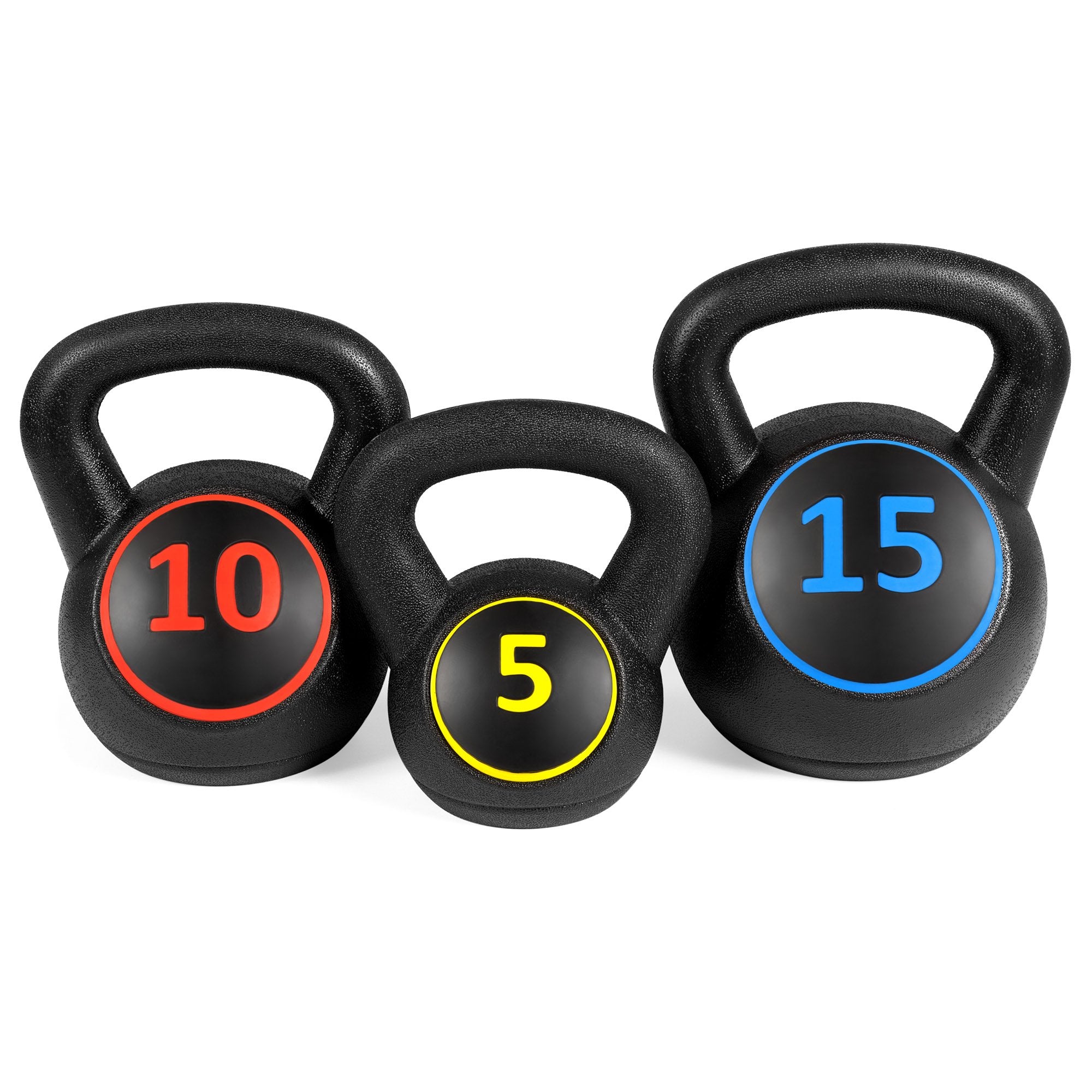 • SET OF 3 KETTLEBELLS: Weights of 5, 10, and 15 pounds are included in this set to help you target all major muscle groups in a variety of exercise options