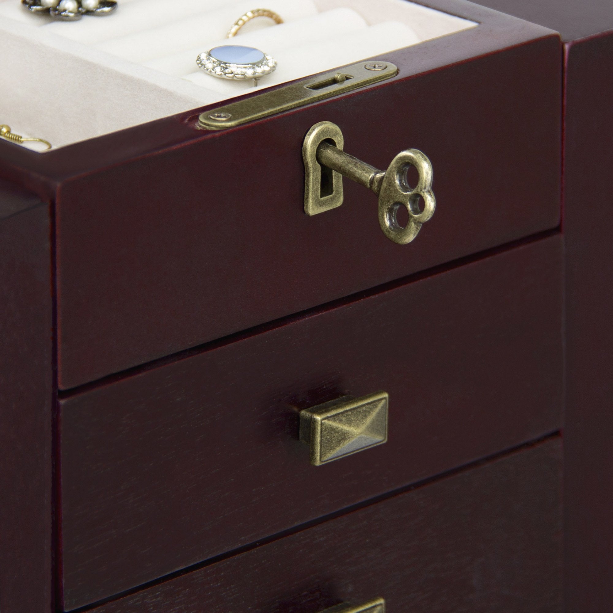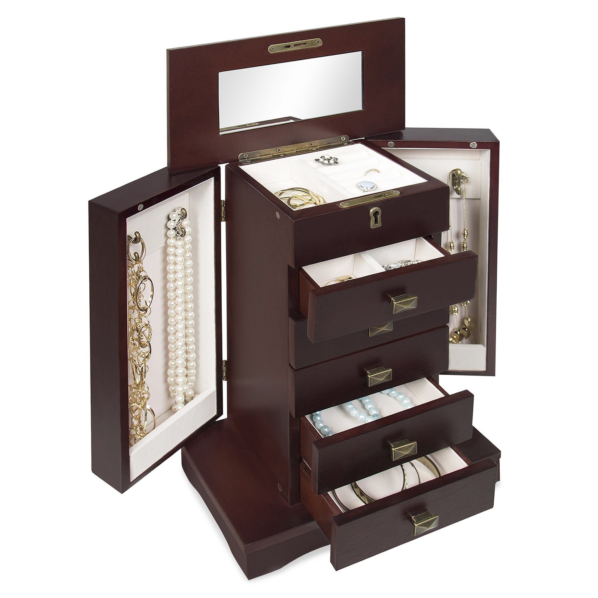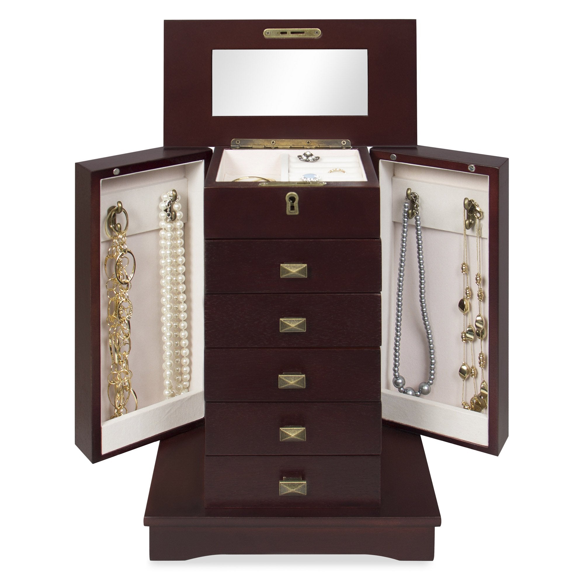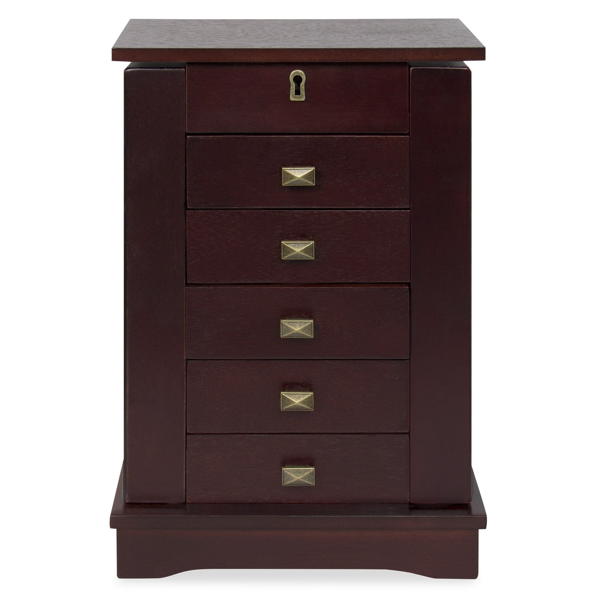 8 STORAGE COMPARTMENTS: Jewelry cabinet armoire is designed with 5 pull out drawers, 2 side compartments, and a top drawer