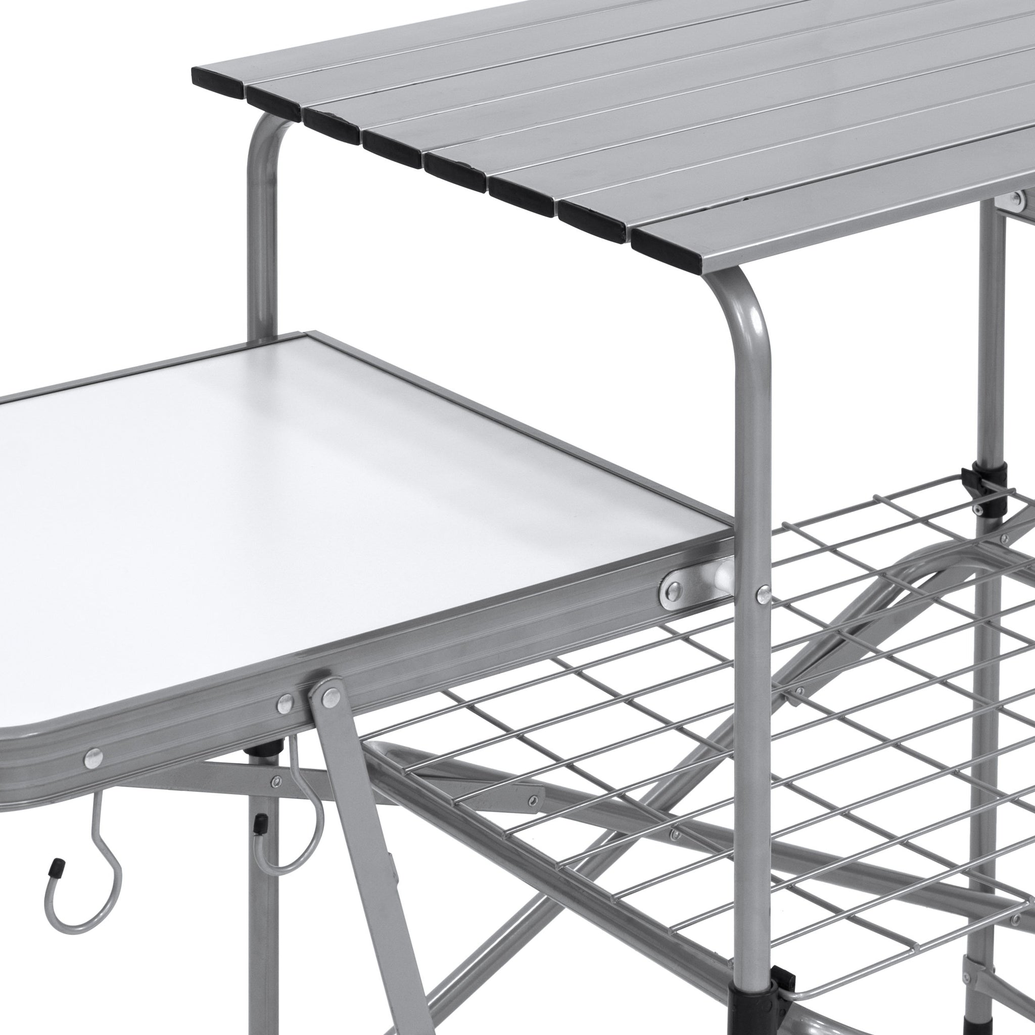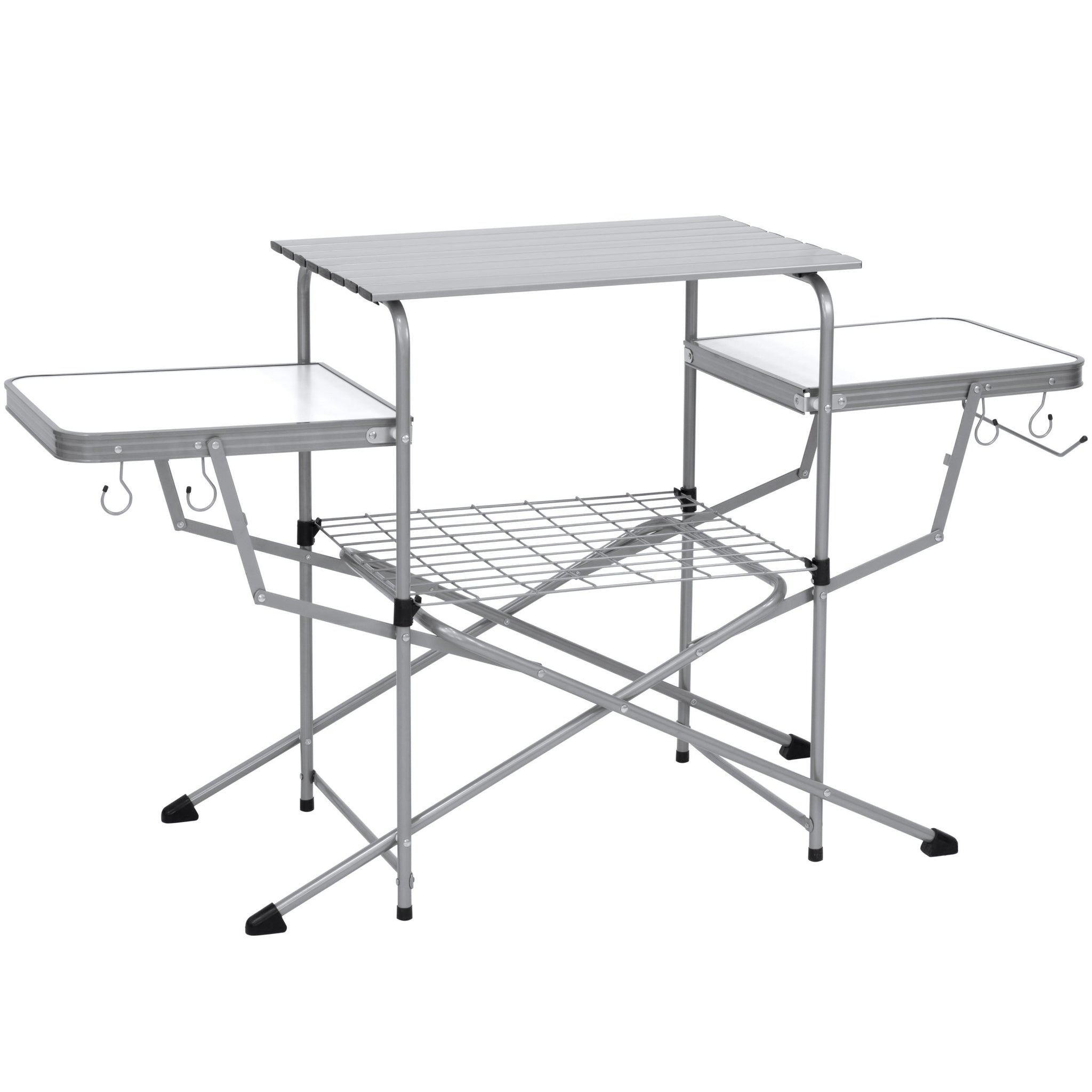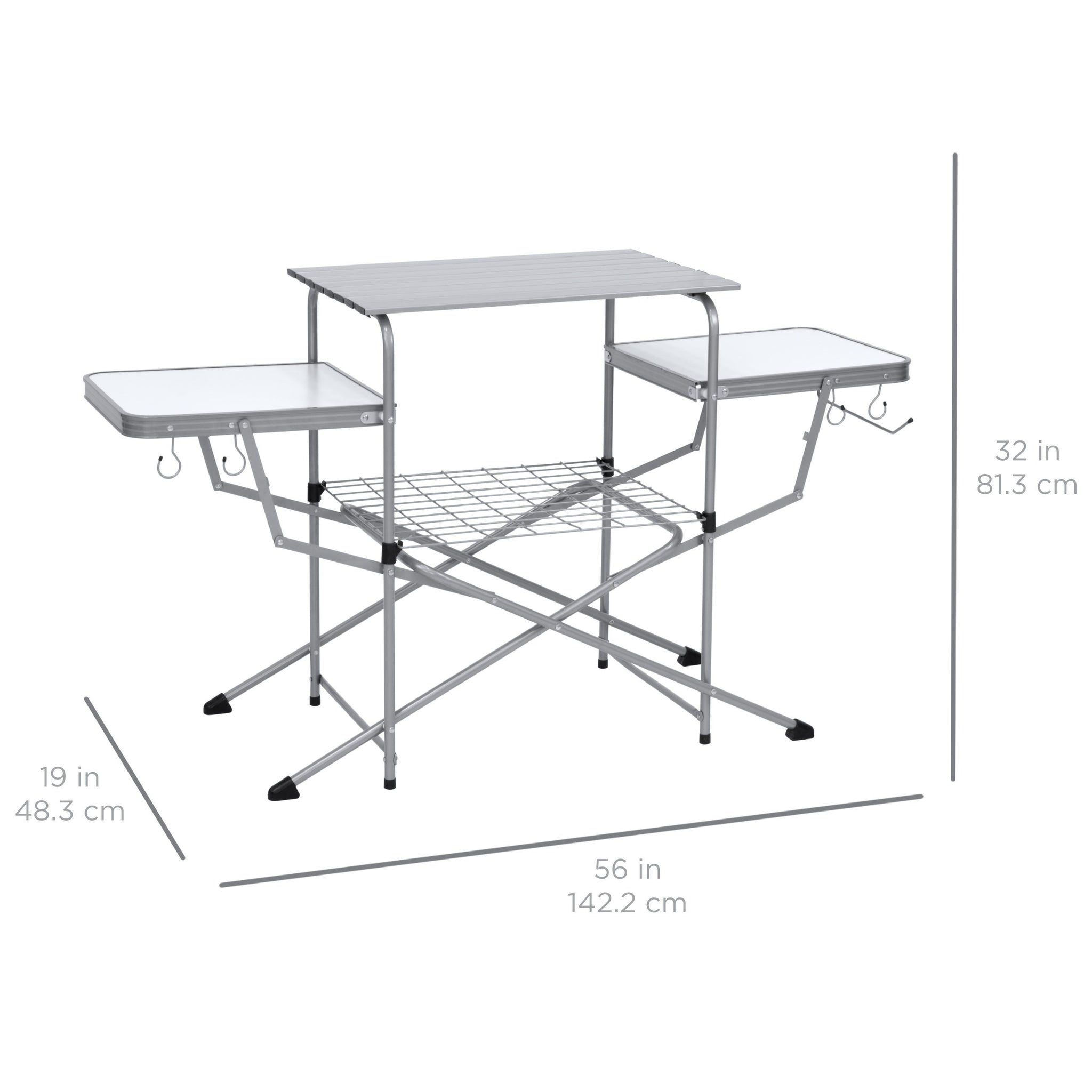 ALL-IN-ONE: 3 spacious tabletops, a wire rack, 4 hanging hooks, and a paper towel holder keep your grilling necessities within arm's reach