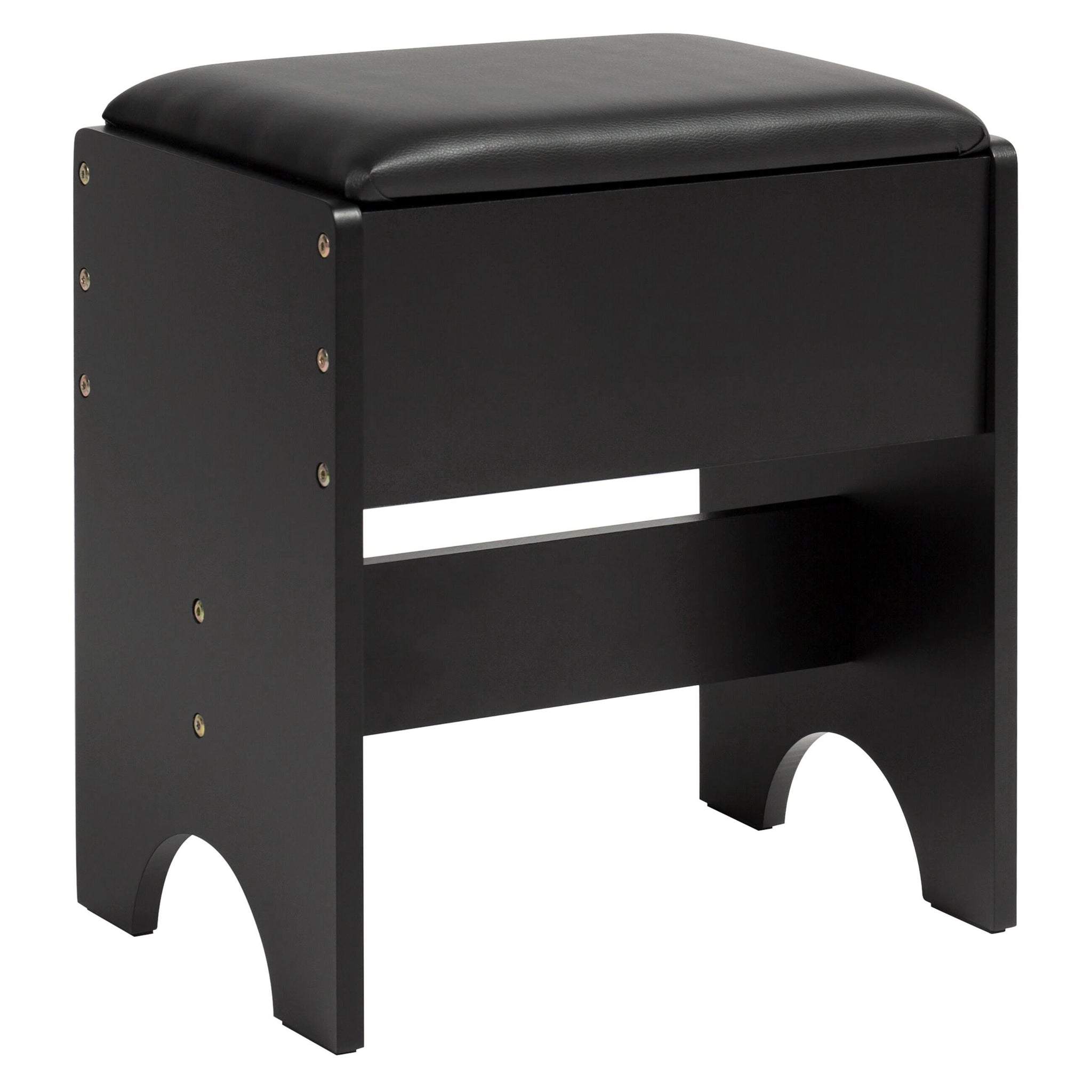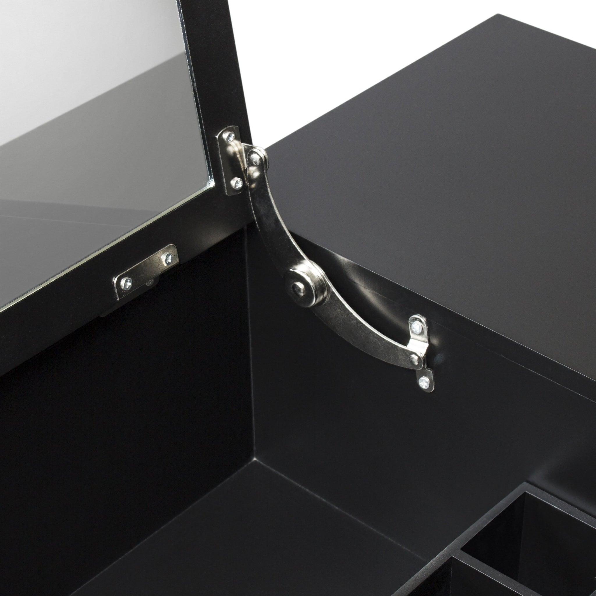 Middle section lifts to reveal a mirror, allowing you to comfortably sit on the cushioned stool and prepare for a night out
