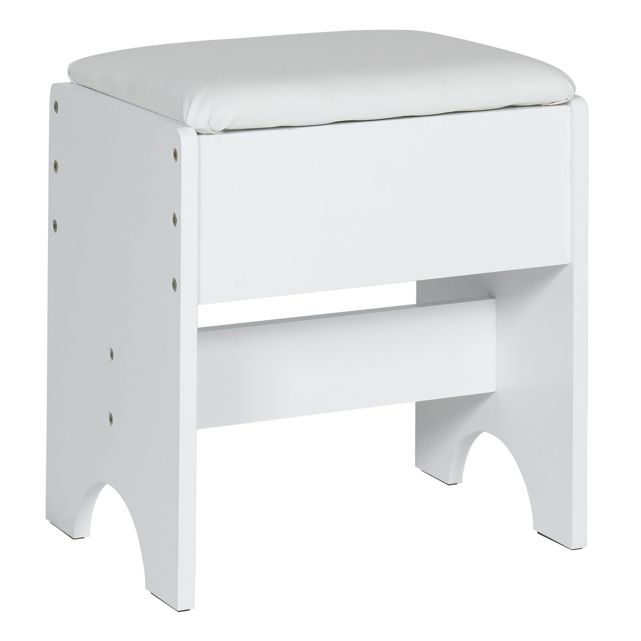 Middle section lifts to reveal a mirror, allowing you to comfortably sit on the cushioned stool and prepare for a night out