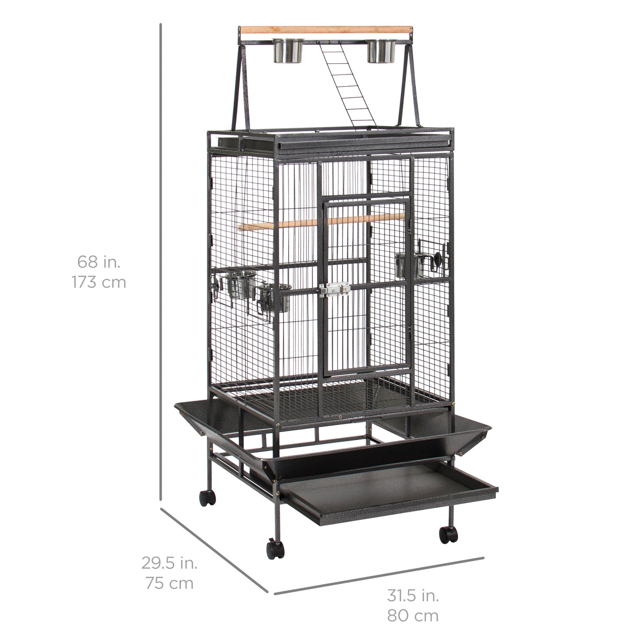 68in Bird Cage w/ Long Wooden Perch, Play Area, and Rolling Wheels - Black