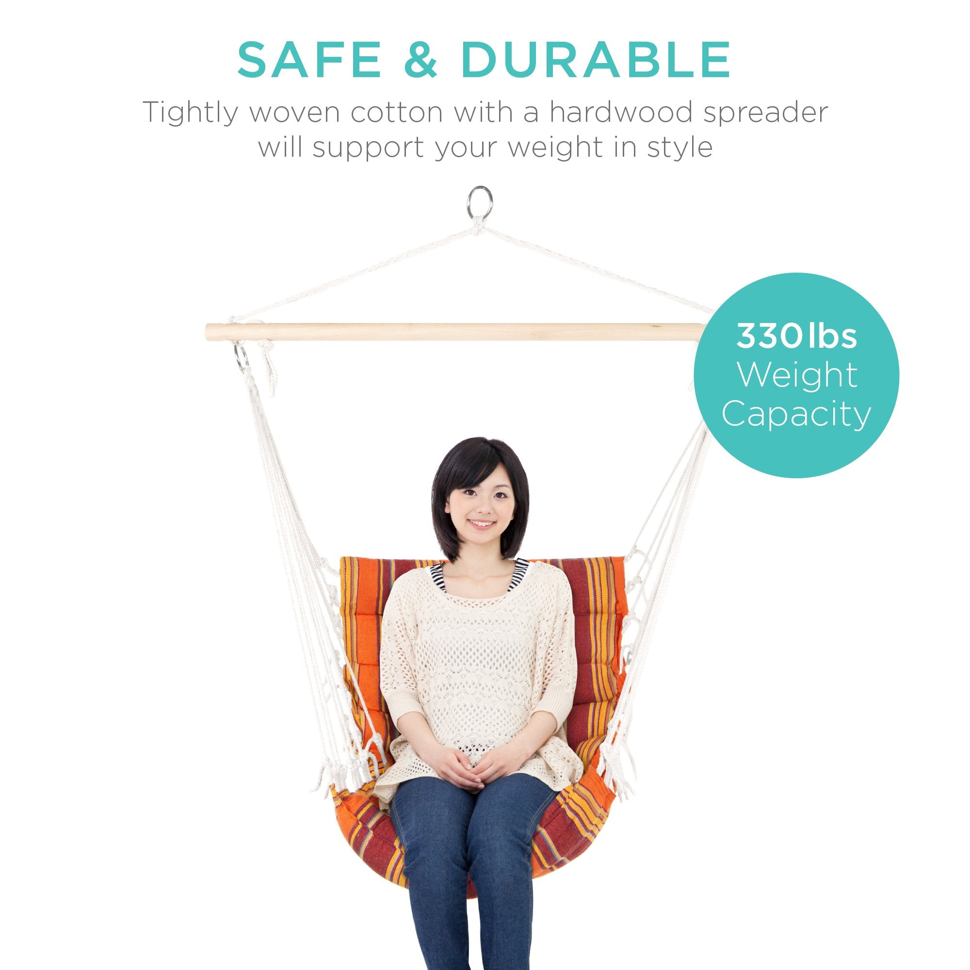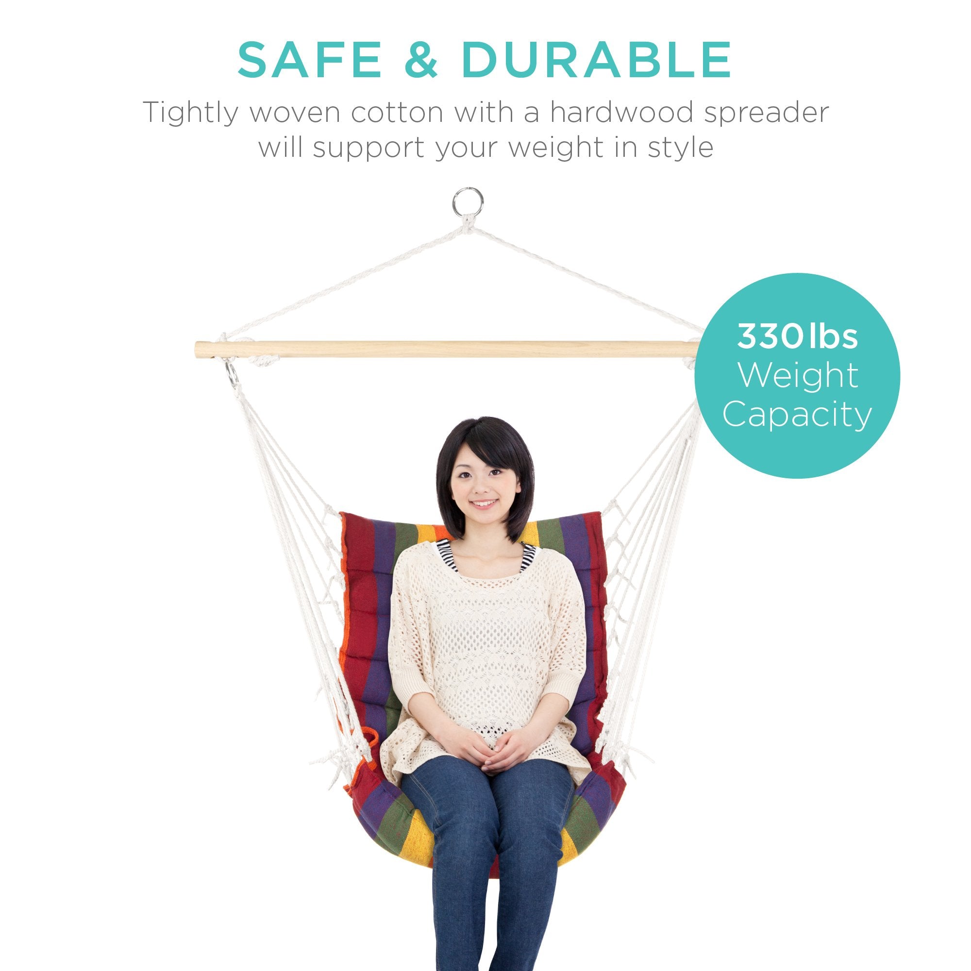 DURABLE MATERIALS: Plated steel rings, durable poly rope, and an included 40-inch hardwood spreader bar keep this hammock sturdy and able to withstand up to 330 lbs.