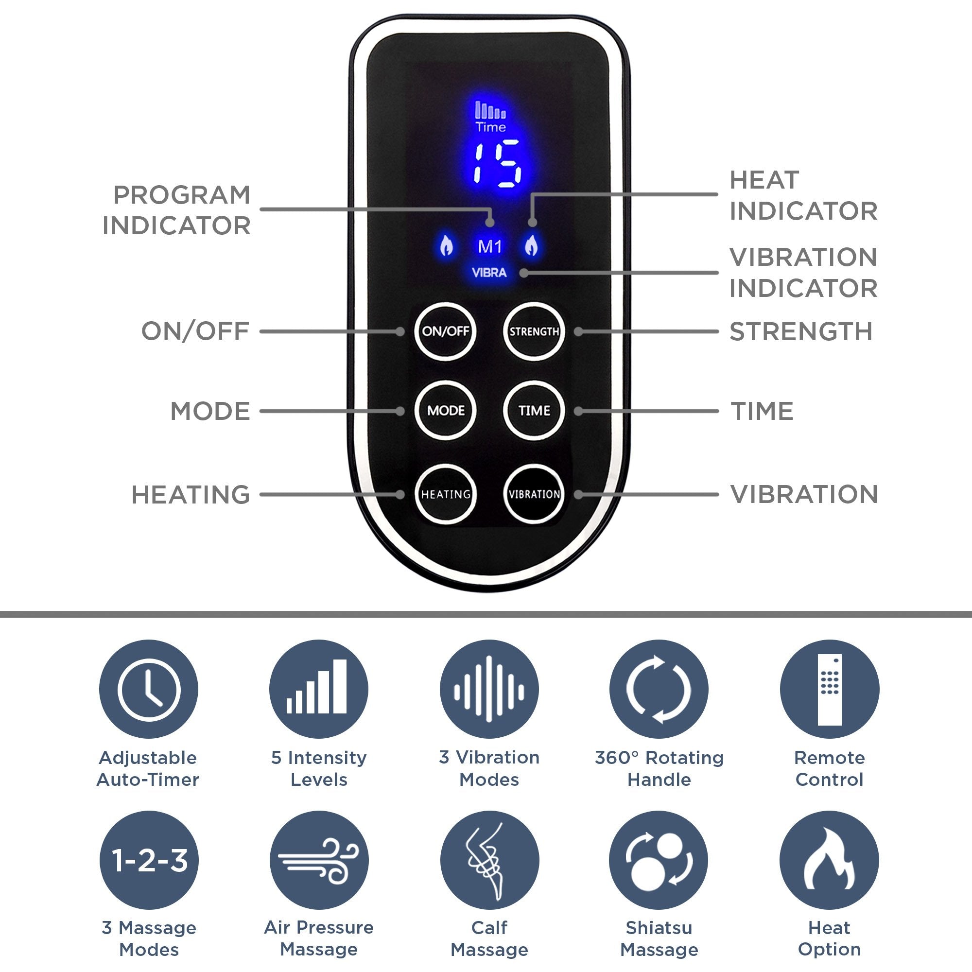• AIR COMPRESSION MASSAGER: A series of air bags inflate and deflate to press against your problem areas and relieve tension