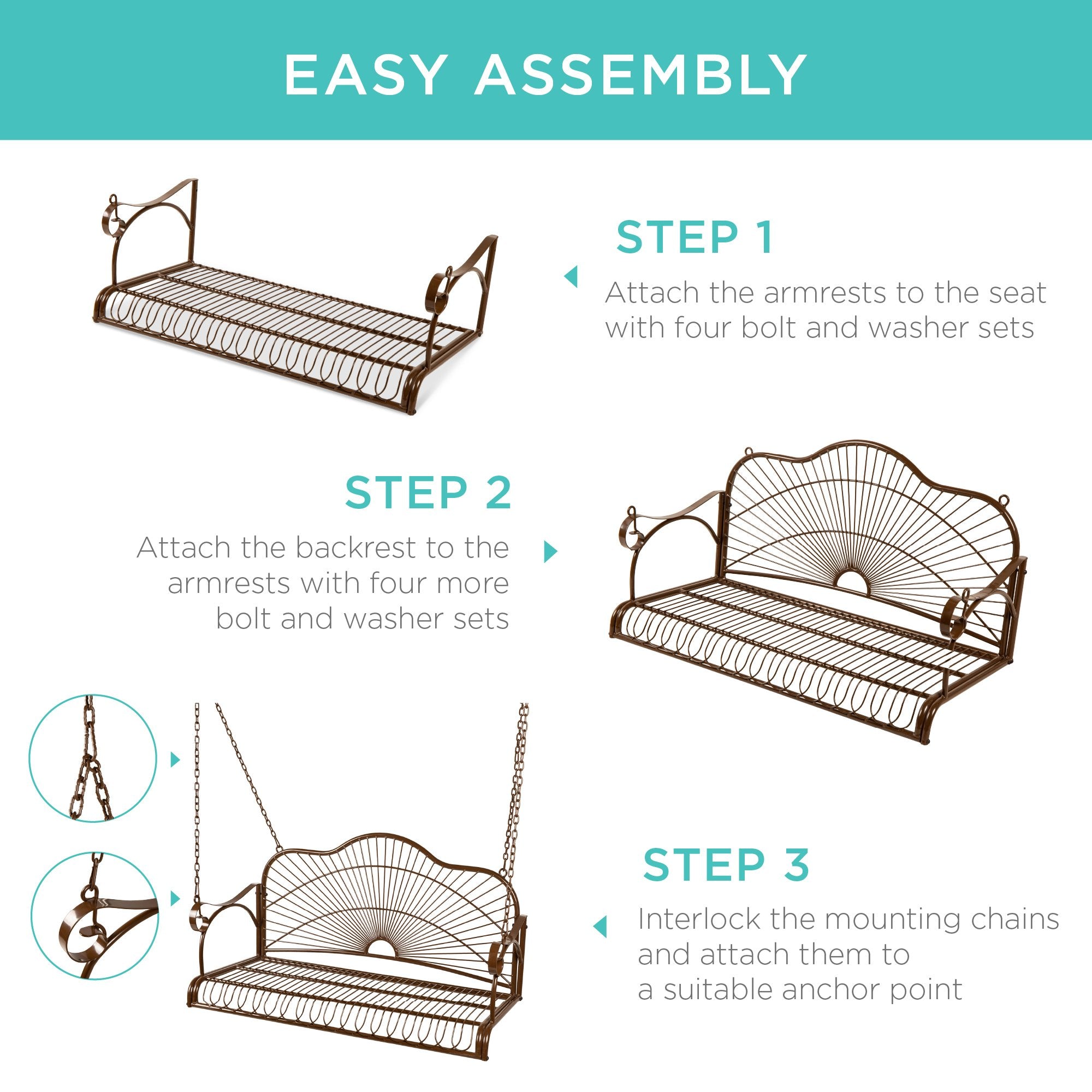DURABLE CONSTRUCTION: Crafted with rust-resistant powder-coated iron, and a set of mounting chains to keep the bench safely anchored in place
