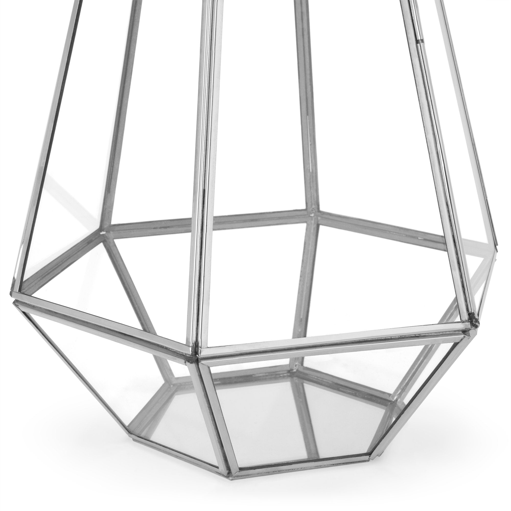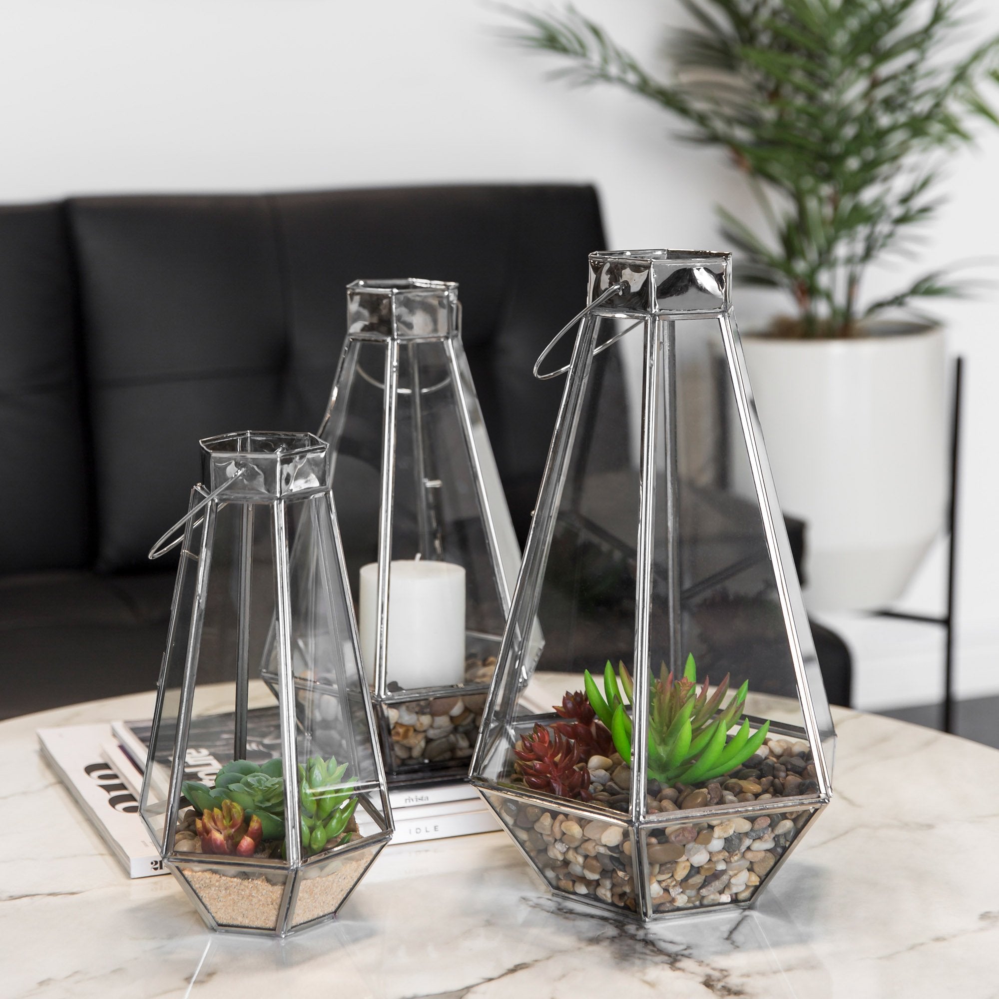 Set of 3 Decorative Metal Faceted Hurricane Candle Lantern Accents w/ Glass