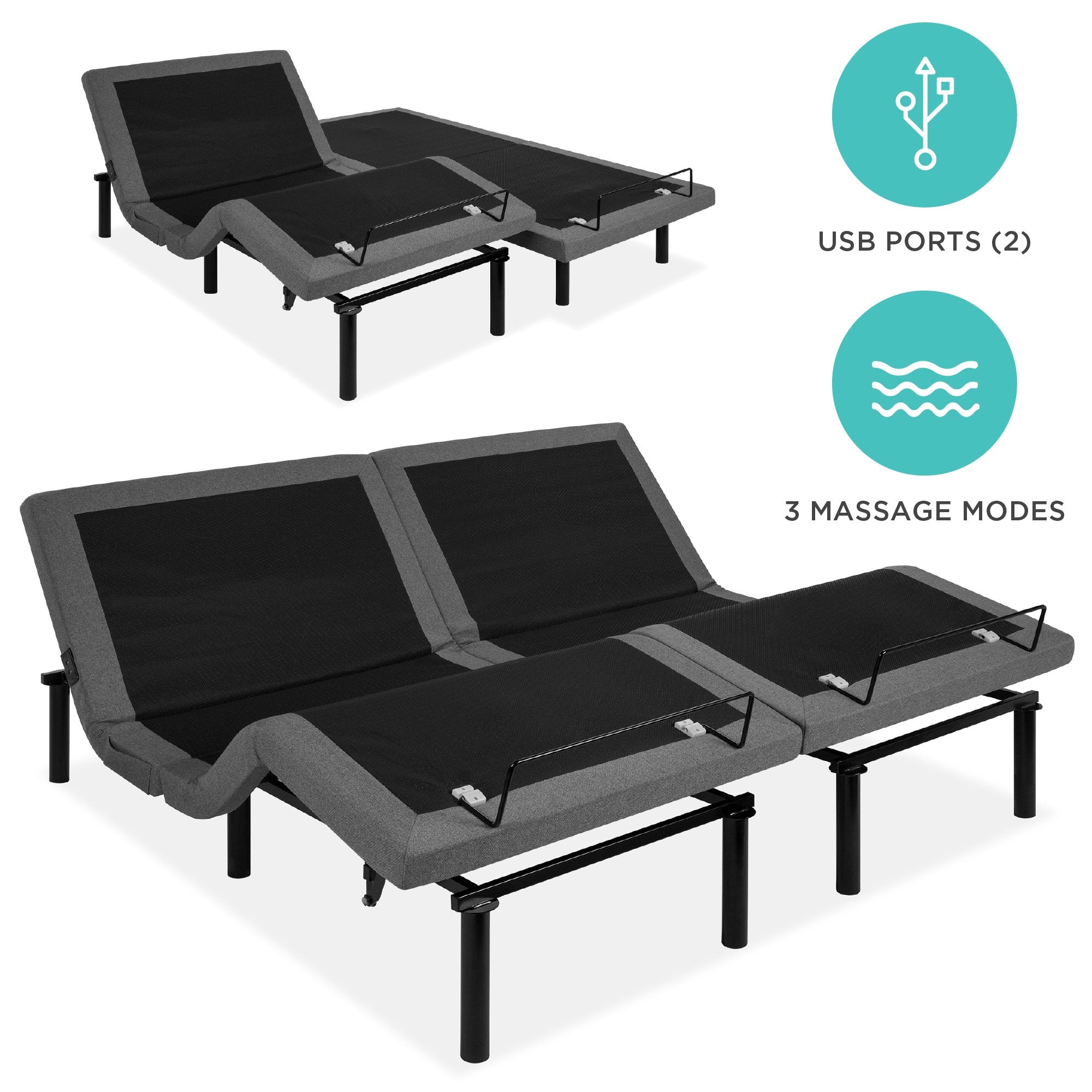 Split King Size Adjustable Bed Base with Massage, Remote, USB Ports